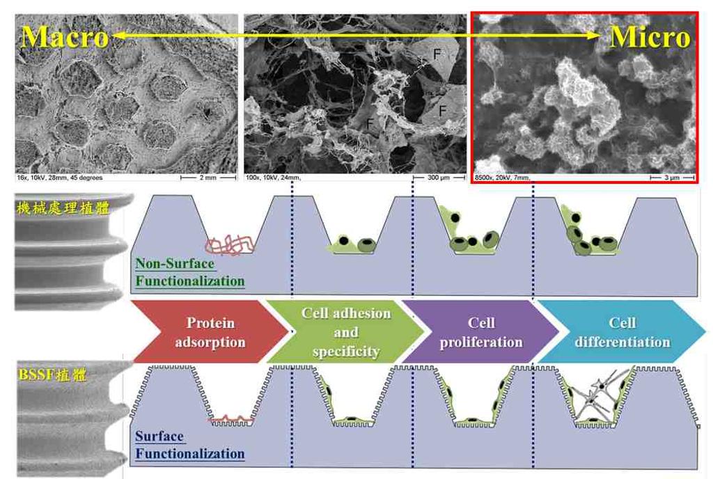 BSSF技術應用在植體上將具有等向性內蝕刻之三維微奈米複合多孔性結構,能增加植體與周圍骨床之機械性嵌合 (mechanical interlock),合適的粗糙表面有助於細胞和基底質初期貼附,形成骨細胞增生及分化表現,優異的表面親水性可使細胞增殖率增加,良好之血液相容性可引導血液中之蛋白質吸附,繼而使血小板吸附與活化。SEO關鍵字句